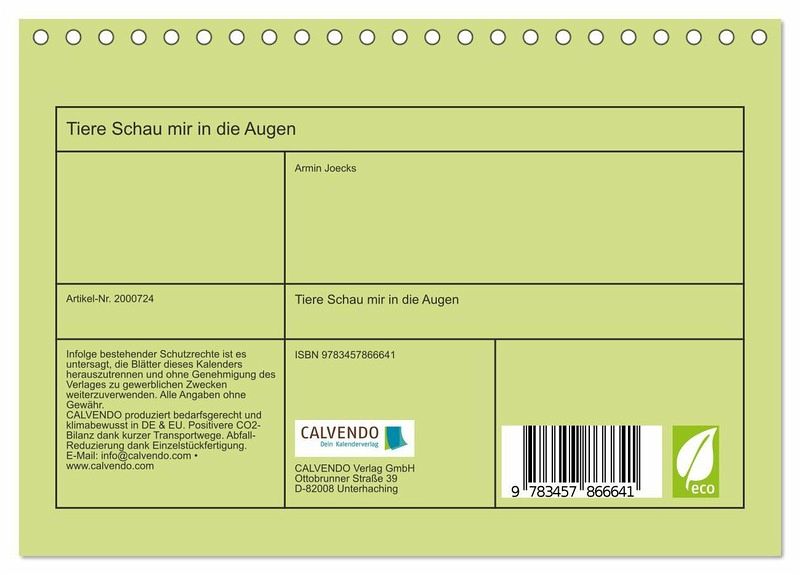QUALITÄT - Hochwertiger Fotokalender mit 12 wunderschönen Motiven auf lichtbeständigem Bilderdruckpapier, robuste Spiralbindung.NACHHALTIG - deutliche Abfallreduzierung durch bedarfsgerechte Einzelstückfertigung, umweltfreundliches FSC-zertifiziertes Papier, Produktion in Deutschland, klimabewusste Logistik.PERFEKTES GESCHENK - Kalender für Freunde und Familie, für Kinder und Erwachsene, jung und alt, zu Weihnachten, Geburtstag oder zwischendurch.VIELFALT - Bildkalender in verschiedenen Formaten, z.B. DIN A5, DIN A4, DIN A3 sowie DIN A2. Ob Naturmotiv, Gemälde oder Fotos, ideal für ein persönliches Wohlfühlambiente.Von Auge zu Auge mit den Tieren der Welt von Autor(in): Armin Joecks