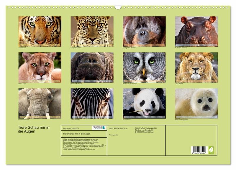 QUALITÄT - Hochwertiger Fotokalender mit 12 wunderschönen Motiven auf lichtbeständigem Bilderdruckpapier, robuste Spiralbindung mit Aufhängebügel.NACHHALTIG - deutliche Abfallreduzierung durch bedarfsgerechte Einzelstückfertigung, umweltfreundliches FSC-zertifiziertes Papier, Produktion in Deutschland, klimabewusste Logistik.PERFEKTES GESCHENK - Kalender für Freunde und Familie, für Kinder und Erwachsene, jung und alt, zu Weihnachten, Geburtstag oder zwischendurch.VIELFALT - Bildkalender in verschiedenen Formaten, z.B. DIN A5, DIN A4, DIN A3 sowie DIN A2. Ob Naturmotiv, Gemälde oder Fotos, ideal für ein persönliches Wohlfühlambiente.Von Auge zu Auge mit den Tieren der Welt von Autor(in): Armin Joecks