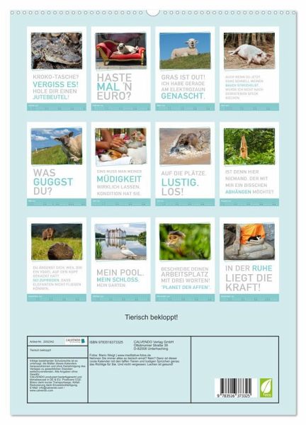 PREMIUM-LINIE - Brillanter Fotokalender mit 12 wunderschönen Motiven, Kunstdruck in Hochglanz in Museumsqualität.QUALITÄT - edle Materialien, stabile Rückwand mit 2 innovativen Einstecktaschen für eine optimale Präsentation an der Wand.NACHHALTIG - deutliche Abfallreduzierung durch bedarfsgerechte Einzelstückfertigung, umweltfreundliches FSC-zertifiziertes Papier, Produktion in Deutschland, klimabewusste Logistik.PERFEKTES GESCHENK - Kalender für Freunde und Familie, für Kinder und Erwachsene, jung und alt, zu Weihnachten, Geburtstag oder zwischendurch.Coole Tiere, freche Sprüche! von Autor(in): Mario Weigt