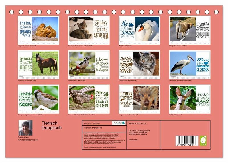 Beliebte deutsche Tier-Sprichwörter wurden ohne Rücksicht auf Verluste für Sie ins Englische übersetzt. Das klingt oft total idiotisch, versteht kein Engländer, lädt aber zum Lachen ein. Der lustige Text im Handlettering-Stil und passende Tierfotos erfreuen Sie jeden Monat und zaubern Ihnen ein Lächeln ins Gesicht.