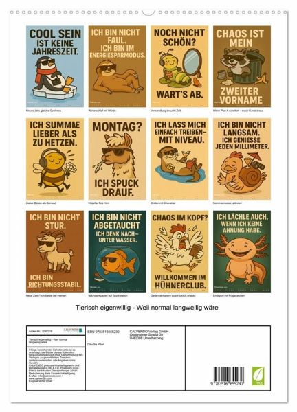 PREMIUM-LINIE - Brillanter Fotokalender mit 12 wunderschönen Motiven, Kunstdruck in Hochglanz in Museumsqualität.QUALITÄT - edle Materialien, stabile Rückwand mit 2 innovativen Einstecktaschen für eine optimale Präsentation an der Wand.NACHHALTIG - deutliche Abfallreduzierung durch bedarfsgerechte Einzelstückfertigung, umweltfreundliches FSC-zertifiziertes Papier, Produktion in Deutschland, klimabewusste Logistik.PERFEKTES GESCHENK - Kalender für Freunde und Familie, für Kinder und Erwachsene, jung und alt, zu Weihnachten, Geburtstag oder zwischendurch.Zwölf eigenwillige Tiere, schräge Sprüche und eine ordentliche Portion Selbstironie - perfekt für alle, die ihren eigenen Kopf haben. von Autor(in): Claudia Pilon