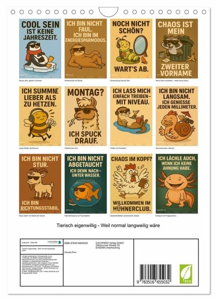 QUALITÄT - Hochwertiger Fotokalender mit 12 wunderschönen Motiven auf lichtbeständigem Bilderdruckpapier, robuste Spiralbindung mit Aufhängebügel.NACHHALTIG - deutliche Abfallreduzierung durch bedarfsgerechte Einzelstückfertigung, umweltfreundliches FSC-zertifiziertes Papier, Produktion in Deutschland, klimabewusste Logistik.PERFEKTES GESCHENK - Kalender für Freunde und Familie, für Kinder und Erwachsene, jung und alt, zu Weihnachten, Geburtstag oder zwischendurch.VIELFALT - Bildkalender in verschiedenen Formaten, z.B. DIN A5, DIN A4, DIN A3 sowie DIN A2. Ob Naturmotiv, Gemälde oder Fotos, ideal für ein persönliches Wohlfühlambiente.Zwölf eigenwillige Tiere, schräge Sprüche und eine ordentliche Portion Selbstironie - perfekt für alle, die ihren eigenen Kopf haben. von Autor(in): Claudia Pilon