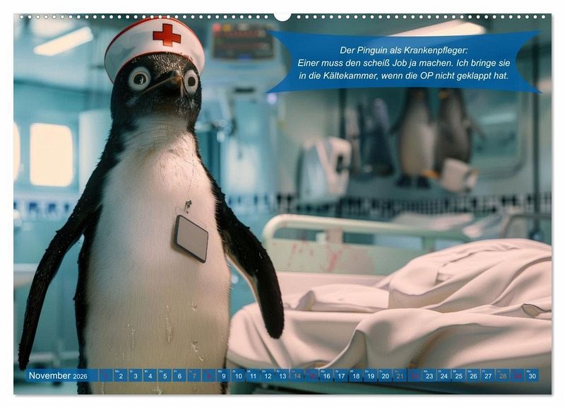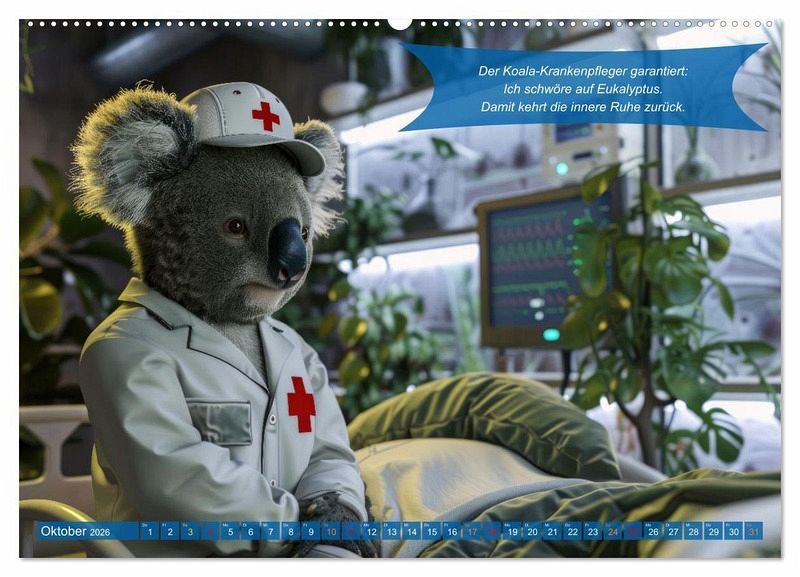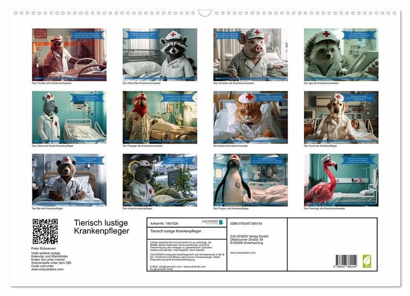 Entdecken Sie den ultimativen Jahreskalender für alle, die im Krankenhaus oder in der Pflege arbeiten. "Tierisch lustige Krankenpfleger". Tauchen Sie Monat für Monat in eine Welt voller Liebe und Humor ein, in der charmante Tiere in die Rollen von Krankenschwestern und Pflegern schlüpfen. Dieser mit KI generierte Kalender bringt ein Lächeln in den herausfordernden Alltag des medizinischen Personals. Jedes Bild erzählt eine eigene Geschichte von Mitgefühl, Hingabe und den kleinen Freuden, die den Krankenhausalltag erleichtern. Perfekt für jeden, der im Gesundheitswesen tätig ist oder jemandem eine besondere Freude machen möchte. Mit diesem Kalender an der Wand wird jeder Tag zu einem kleinen Abenteuer. Ein ideales Geschenk, das nicht nur die Wände schmückt, sondern auch Herzen erwärmt.