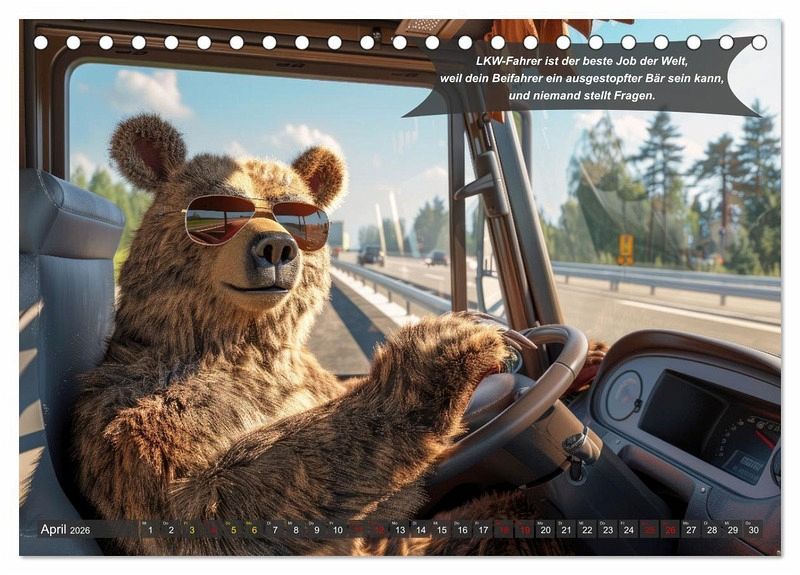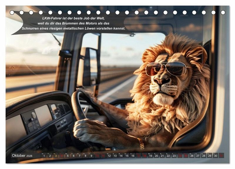 Entdecken Sie den ultimativen Jahreskalender für alle LKW-Fahrer und Trucker mit Humor: "Tierisch lustige LKW-Fahrer". Dieser einzigartige Kalender ist die perfekte Mischung aus Spaß und Faszination, die jeden Monat aufs Neue begeistert. Mit einer sorgfältig ausgewählten Sammlung von KI generierten Bildern, die Tiere im Führerhaus zeigen, begleitet von urkomischen Sprüchen, ist dieser Kalender mehr als nur eine Datumsanzeige - er ist ein täglicher Stimmungsaufheller. Ob für sich selbst oder als Geschenk, dieser Kalender ist die ideale Wahl für jeden, der im Transportgewerbe tätig ist und sich oder seinen Kollegen ein Lächeln schenken möchte. Ideal für Geburtstage, Feiertage oder als kleine Aufmerksamkeit zwischendurch - mit diesem Kalender liegen Sie immer richtig.