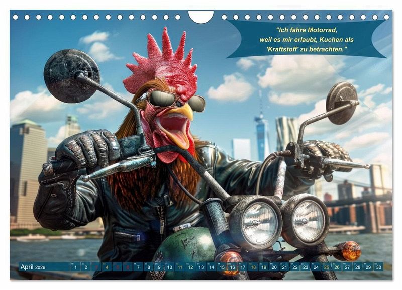 April: Hahn beim Motorradfahren