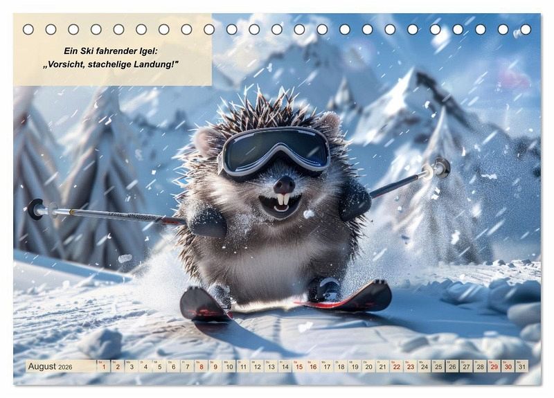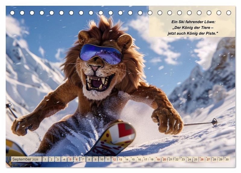 Tauchen Sie ein in die Welt des Wintersports wie nie zuvor mit unserem Jahreskalender mit lustigen Tieren. Jeder Monat überrascht mit einem einzigartigen KI generierten Bild, das Tiere in den lustigsten Skifahrer-Positionen zeigt. Begleitet von humorvollen und inspirierenden Zitaten, ist dieser Kalender mehr als nur eine Datumsanzeige - er ist eine Einladung zum Lachen und Träumen.