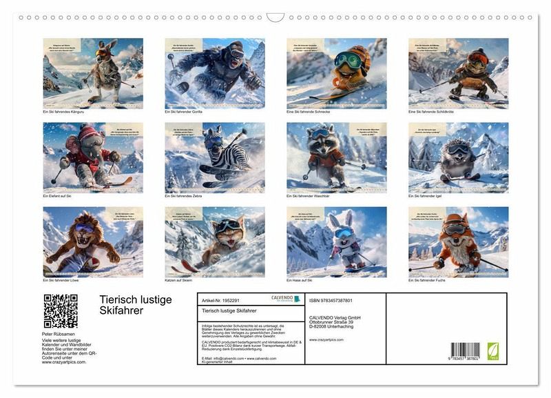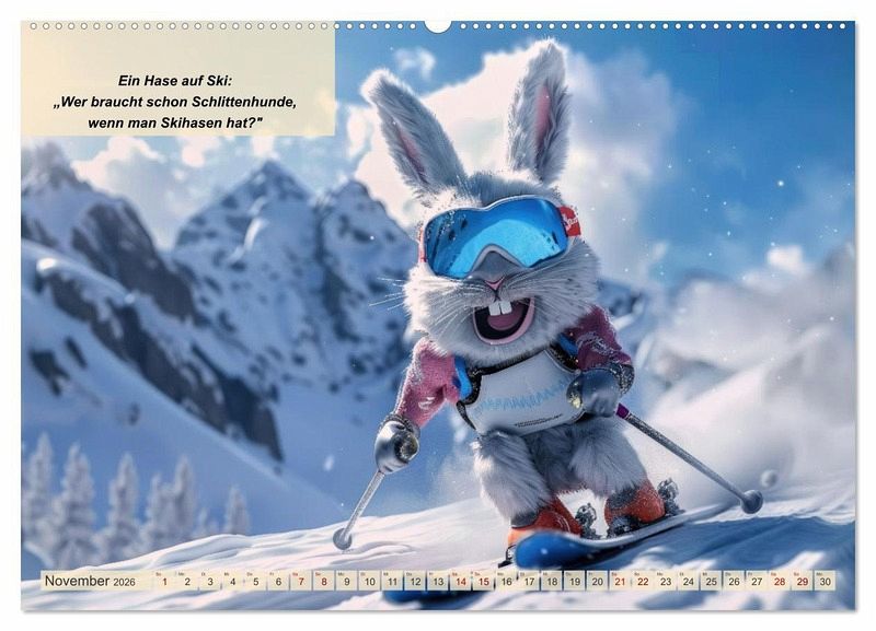 Tauchen Sie ein in die Welt des Wintersports wie nie zuvor mit unserem Jahreskalender mit lustigen Tieren. Jeder Monat überrascht mit einem einzigartigen KI generierten Bild, das Tiere in den lustigsten Skifahrer-Positionen zeigt. Begleitet von humorvollen und inspirierenden Zitaten, ist dieser Kalender mehr als nur eine Datumsanzeige - er ist eine Einladung zum Lachen und Träumen.