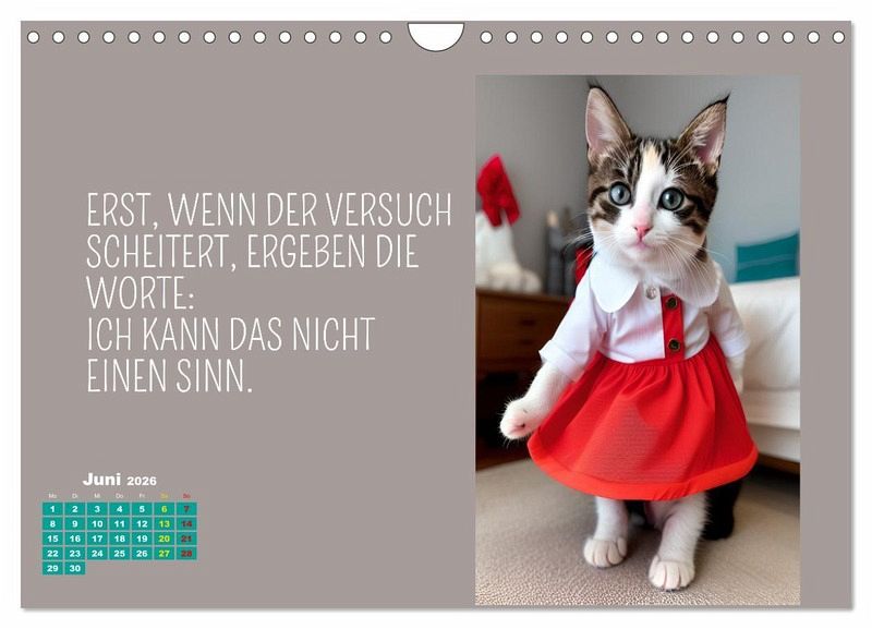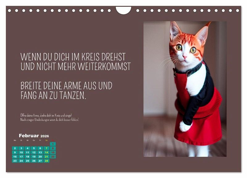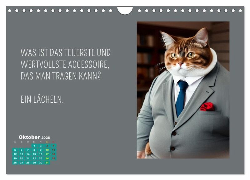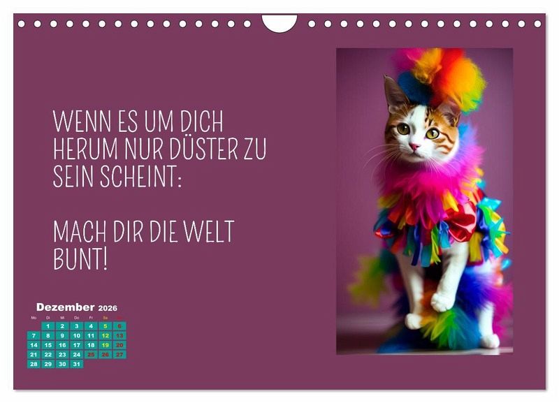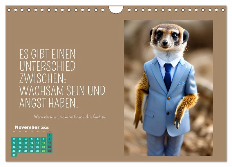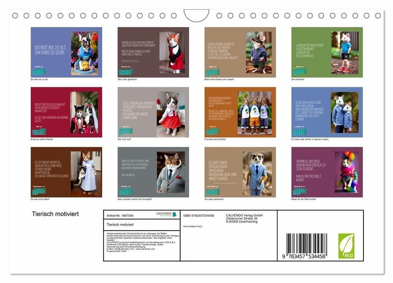 Der Calvendo Kalender "Tierisch motiviert" ist ein wahrer Wandschmuck für alle Tierliebhaber und Fans von neuen Lebensweisheiten und motivierenden Sprüchen. Die Autorin und Designerin Silvia Siebler-Ferry hat die Tiere vermenschlicht und ihnen auf charmante Art neue Persönlichkeiten verliehen. Der Kalender ist nicht nur schön anzusehen, sondern auch inspirierend. Jeden Monat gibt es einen neuen motivierenden Spruch, der uns daran erinnert, achtsam durchs Leben zu gehen. Dank der hochwertigen AI-Technologie sind die Bilder gestochen scharf und lassen jedes Tierherz höher schlagen. Ein Must-Have für jeden, der sich von Tieren inspirieren lassen möchte!