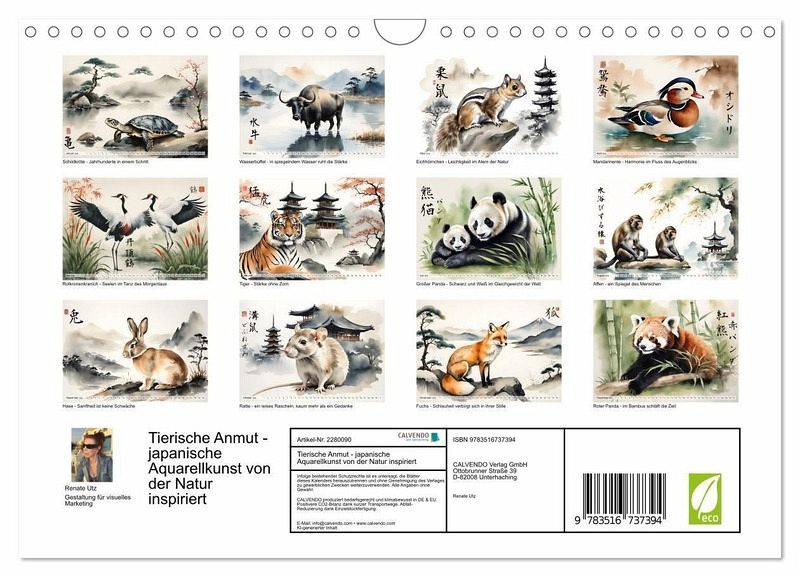 Erlebe Poesie in Farbe! Lass dich verzaubern von harmonischen Tierdarstellungen der japanischen Aquarellmalerei, wo zarte Pinselstriche und fließende Farben die Seele der Tiere berühren. Japanische Schriftzeichen und Kanji im Stil japanischer Tuschmalerei, welche die dargestellten Tiere beschreiben, unterstützen den fernöstlichen Stil der meditativen Darstellungen. Mithilfe von KI hat Renate Utz die japanische Ästhetik neu interpretiert und im Fluss der Farben zum Leben erweckt. Dieser Kalender ist eine Hommage an die stille Eleganz japanischer Malkunst und die lebendige Schönheit von Tierwelt und Natur. Perfekt für Liebhaber fernöstlicher Kunst, Malerei und Zen-Ästhetik. Ein Kalender, der die Seele bewegt.