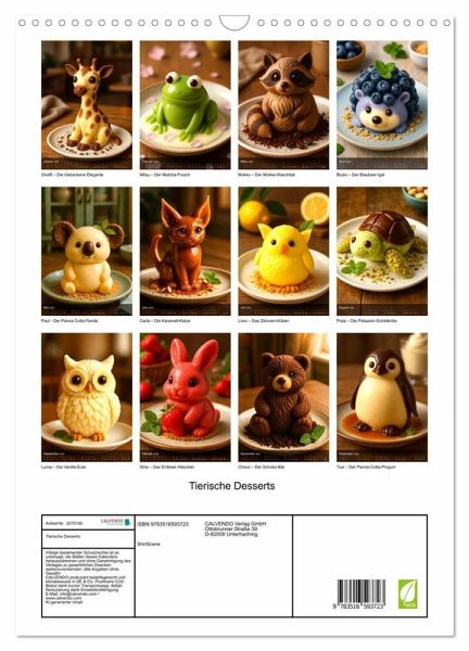 KI generiert. Ob Koala aus Vanillepudding, Fuchs aus Honigcreme oder Hase aus Erdbeerflan - dieser Kalender verbindet kreative Food-Art mit süßen Tierfiguren in perfekter Dessert-Inszenierung. Zwölf detailverliebte und originelle Kompositionen lassen das Herz von Naschkatzen, Designliebhabern und Tierfreunden höherschlagen. Fotorealistisch, fantasievoll und garantiert zum Dahinschmelzen! Ideal für Küchen, Cafés oder einfach als verspielter Blickfang.