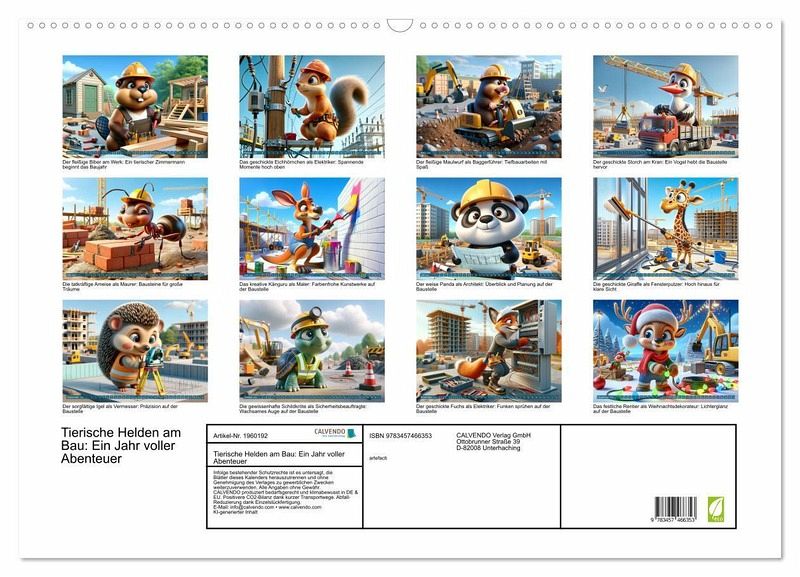 Entdecken Sie 'Tierische Helden am Bau: Ein Jahr voller Abenteuer', einen einzigartigen Kalender, der die Welt der Baustellen in einem neuen Licht zeigt. Jedes Blatt präsentiert eine faszinierende, mit künstlicher Intelligenz erschaffene 3D-Illustration, die Tiere in verschiedenen Bauberufen darstellt. Vom fleißigen Biber bis zum geschickten Pinguin - diese liebevoll gestalteten Bilder wecken die Neugier und Begeisterung von Kindern für die bunte Welt des Bauens. Ein perfektes Geschenk, das Kreativität und Lernen spielerisch fördert.