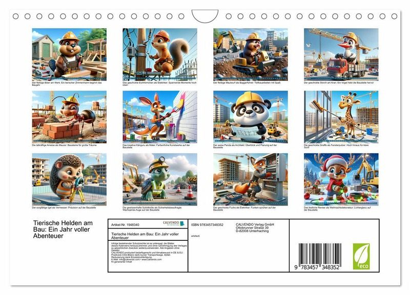 Entdecken Sie 'Tierische Helden am Bau: Ein Jahr voller Abenteuer', einen einzigartigen Kalender, der die Welt der Baustellen in einem neuen Licht zeigt. Jedes Blatt präsentiert eine faszinierende, mit künstlicher Intelligenz erschaffene 3D-Illustration, die Tiere in verschiedenen Bauberufen darstellt. Vom fleißigen Biber bis zum geschickten Pinguin - diese liebevoll gestalteten Bilder wecken die Neugier und Begeisterung von Kindern für die bunte Welt des Bauens. Ein perfektes Geschenk, das Kreativität und Lernen spielerisch fördert.