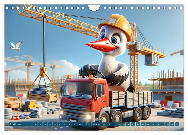 April: Der geschickte Storch am Kran: Ein Vogel hebt die Baustelle hervor