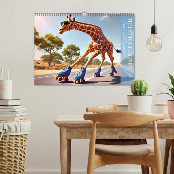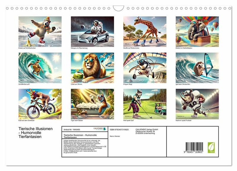 Dieser farbenfrohe Kalender bringt Ihnen ein Jahr voller kreativer, lustiger Tierdarstellungen. Jedes Bild kombiniert Witz mit Fantasie, von einem Eisbären auf Schlittschuhen bis zu einem Känguru im Raumanzug. Lassen Sie sich von der einzigartigen Kunst verzaubern und genießen Sie die humorvolle Sicht auf unsere tierischen Freunde, die mit Hilfe von KI erstellt wurden.