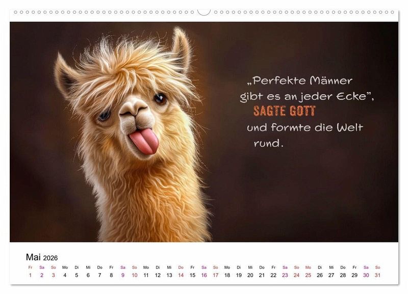Schnallen Sie sich an für ein Jahr voller Humor. Dieser lustige, pfiffige Kalender bringt Sie zum Lachen, Lächeln oder Schmunzeln. Jedes KI-Bild ist ein Highlight: ein witziges Tier - ob ein Pferd mit Hut, zwei völlig unterschiedliche Tierfreunde oder ein lachender Esel - kombiniert mit einem cleveren Spruch, der genau ins Schwarze trifft. Da Lachen ja bekanntlich die Gesundheit fördert und werden solch ulkige Weisheiten dann noch mit passenden Bildern versehen, ist das die vollendete Symbiose. Ein perfektes Geschenk für alle, die nicht nur ein tierisch gutes, sondern auch tierisch witziges Jahr erleben möchten