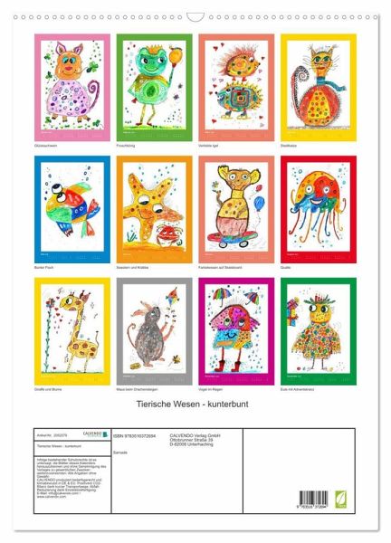 QUALITÄT - Hochwertiger Fotokalender mit 12 wunderschönen Motiven auf lichtbeständigem Bilderdruckpapier, robuste Spiralbindung mit Aufhängebügel.NACHHALTIG - deutliche Abfallreduzierung durch bedarfsgerechte Einzelstückfertigung, umweltfreundliches FSC-zertifiziertes Papier, Produktion in Deutschland, klimabewusste Logistik.PERFEKTES GESCHENK - Kalender für Freunde und Familie, für Kinder und Erwachsene, jung und alt, zu Weihnachten, Geburtstag oder zwischendurch.VIELFALT - Bildkalender in verschiedenen Formaten, z.B. DIN A5, DIN A4, DIN A3 sowie DIN A2. Ob Naturmotiv, Gemälde oder Fotos, ideal für ein persönliches Wohlfühlambiente.Naive Malerei von kunterbunten Tieren von Autor(in): Sarnade
