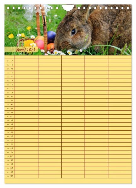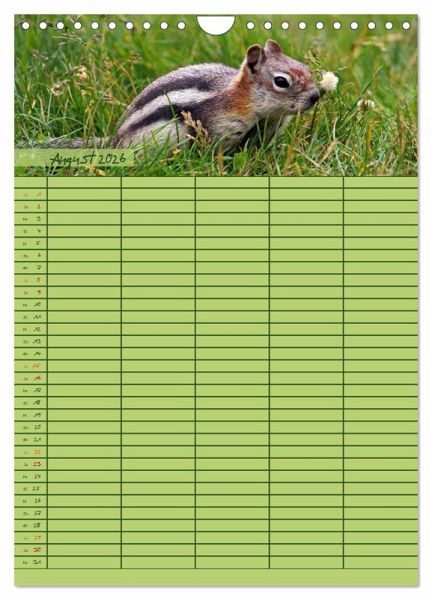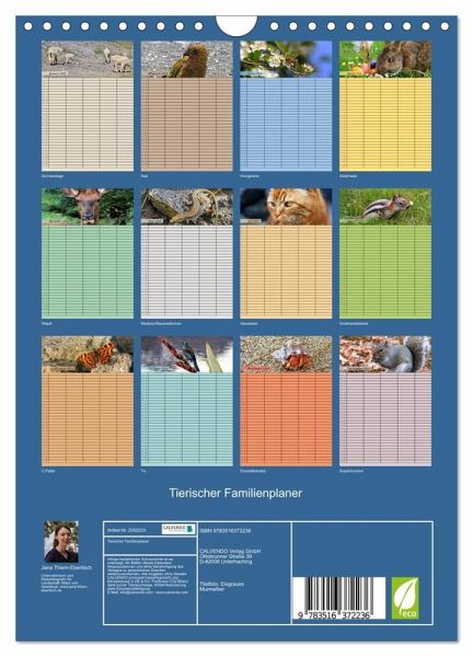 Mit dem tierischen Familienplaner behältst du stets den Überblick! Plane und organisiere innerhalb der Familie oder Wohngemeinschaft alle täglichen Aufgaben. Sonn- und Feiertage sind für dich extra gekennzeichnet. Bis zu fünf Personen können Einträge in den breiten Spalten vornehmen. Dabei wirst du monatlich von 12 verschiedenen Tieren tatkräftig unterstützt. Das gut beschreibbare Papier macht das Eintragen deiner Notizen und Termine zum großen Vergnügen. Dabei verschönern die Fotografien und das farbenfrohe Design gleichzeitig jeden Raum. Mache dir selbst oder anderen eine Freude mit dem tierischen Familienplaner. www.jana-thiem-eberitsch.de
