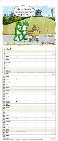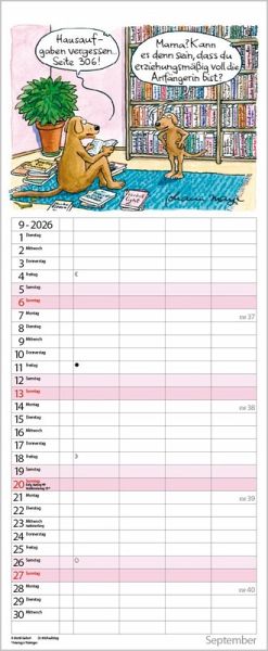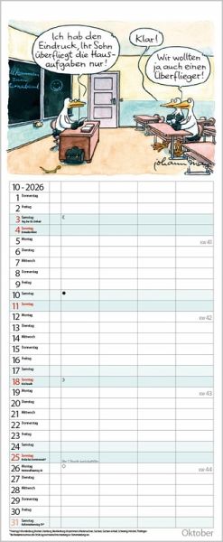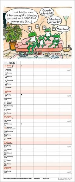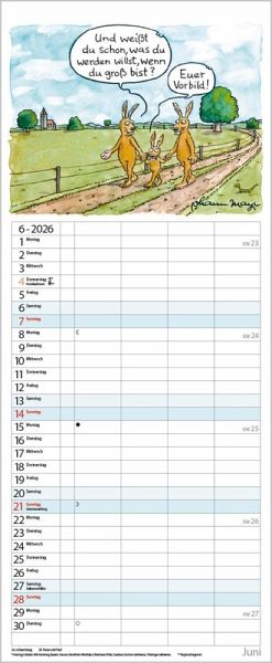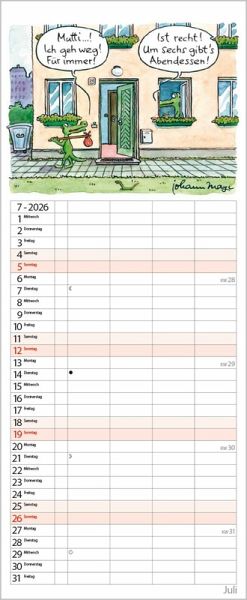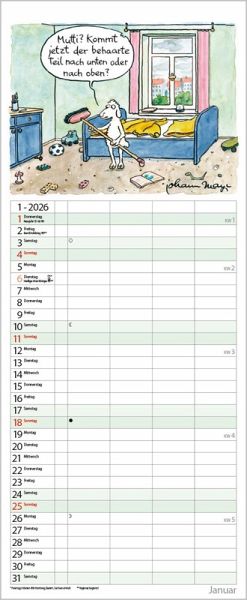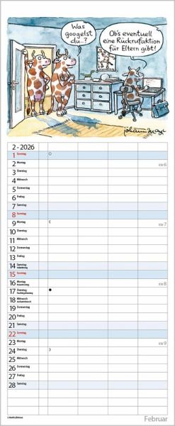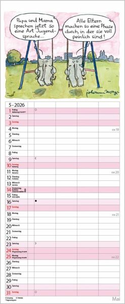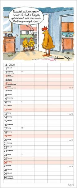 Übersichtlicher Familienplaner für bis zu 4 Personen; sehr stabile Rückwand; 19 x 46 cm Jeden Monat ein lustiger Cartoon über den Spalten. Ohne störende Bilder in den Spalten Dickes, umweltfreundliches FSC Papier; leichte Beschreibbarkeit, auch mit Bunt- und Bleistiften Deutsches Kalendarium mit regionalen Feiertagen für Deutschland, Österreich und Schweiz Farblich hervorgehobene Sonn- und Feiertage, sowie Anzeige der Zeitumstellung
