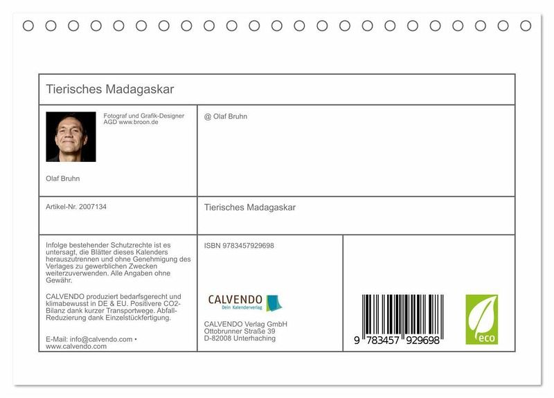 QUALITÄT - Hochwertiger Fotokalender mit 12 wunderschönen Motiven auf lichtbeständigem Bilderdruckpapier, robuste Spiralbindung.NACHHALTIG - deutliche Abfallreduzierung durch bedarfsgerechte Einzelstückfertigung, umweltfreundliches FSC-zertifiziertes Papier, Produktion in Deutschland, klimabewusste Logistik.PERFEKTES GESCHENK - Kalender für Freunde und Familie, für Kinder und Erwachsene, jung und alt, zu Weihnachten, Geburtstag oder zwischendurch.VIELFALT - Bildkalender in verschiedenen Formaten, z.B. DIN A5, DIN A4, DIN A3 sowie DIN A2. Ob Naturmotiv, Gemälde oder Fotos, ideal für ein persönliches Wohlfühlambiente.12 wunderschöne Tieraufnahmen aus Madagaskar von dem Fotografen und Grafik-Designer Olaf Bruhn von Autor(in): Olaf Bruhn