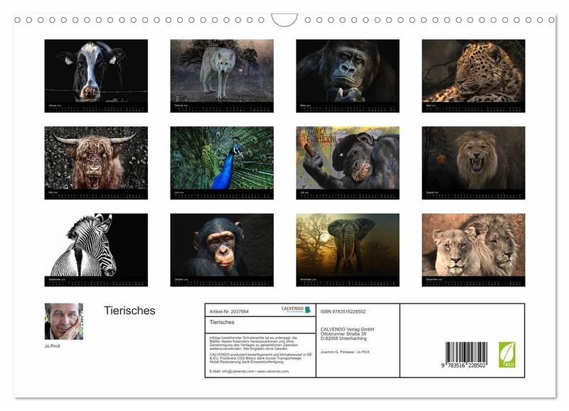 QUALITÄT - Hochwertiger Fotokalender mit 12 wunderschönen Motiven auf lichtbeständigem Bilderdruckpapier, robuste Spiralbindung mit Aufhängebügel.NACHHALTIG - deutliche Abfallreduzierung durch bedarfsgerechte Einzelstückfertigung, umweltfreundliches FSC-zertifiziertes Papier, Produktion in Deutschland, klimabewusste Logistik.PERFEKTES GESCHENK - Kalender für Freunde und Familie, für Kinder und Erwachsene, jung und alt, zu Weihnachten, Geburtstag oder zwischendurch.VIELFALT - Bildkalender in verschiedenen Formaten, z.B. DIN A5, DIN A4, DIN A3 sowie DIN A2. Ob Naturmotiv, Gemälde oder Fotos, ideal für ein persönliches Wohlfühlambiente.Eindrucksvolle Tierbilder von Autor(in): Jo.PinX