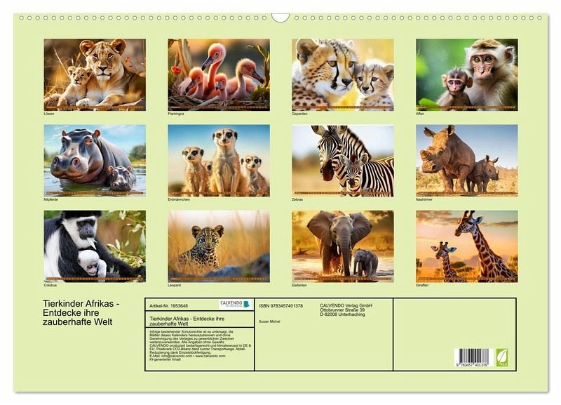 Tauche ein in die faszinierende Welt der Tierkinder Afrikas. Jeden Monat enthüllt er Aufnahmen von jungen Löwen, Elefanten, Giraffen und vielen anderen faszinierenden Bewohnern des afrikanischen Kontinents. Dieser Kalender ist nicht nur eine Quelle der Inspiration, sondern auch ein wunderbares Geschenk für Tierliebhaber und Naturliebhaber jeden Alters. Lass dich von der Schönheit und dem Zauber Afrikas Monat für Monat verzaubern! Dieser Kalender wurde mit Unterstützung der KI erstellt.