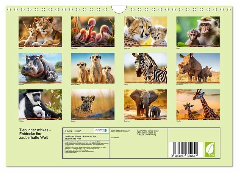 Tauche ein in die faszinierende Welt der Tierkinder Afrikas. Jeden Monat enthüllt er Aufnahmen von jungen Löwen, Elefanten, Giraffen und vielen anderen faszinierenden Bewohnern des afrikanischen Kontinents. Dieser Kalender ist nicht nur eine Quelle der Inspiration, sondern auch ein wunderbares Geschenk für Tierliebhaber und Naturliebhaber jeden Alters. Lass dich von der Schönheit und dem Zauber Afrikas Monat für Monat verzaubern! Dieser Kalender wurde mit Unterstützung der KI erstellt.