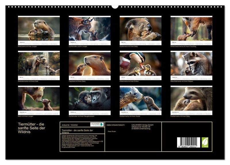 Erleben Sie die unbeschreiblichen zärtlichen Augenblicke zwischen Tiermüttern und ihren Jungen. Kommen Sie mit auf eine visuelle Reise voller Liebe, Fürsorge und unvergesslicher Momente. Monat für Monat erhalten Sie mit diesen liebevoll gestalteten KI-Bildern faszinierende Einblicke in das Leben wilder Tierarten, die in ihrer Zärtlichkeit und Stärke die Natur auf einzigartige Weise verkörpern. Von der Elefantenmama mit ihrem Jungen bis zur Gorillamama mit ihrem Nachwuchs, jedes Bild erzählt eine Geschichte der tiefen Verbindung zwischen Mutter und Kind - bewegend, kraftvoll und einzigartig. Das perfekte Geschenk für Tierliebhaber, Naturschützer oder jeden, der das Herz berühren möchte.