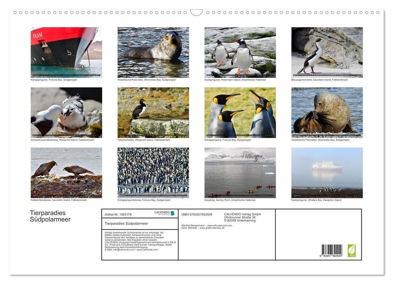 Sie finden in diesem Kalender 13 sorgfältig ausgesuchte, hochwertige Bilder von z.B. Pinguinen, Pelzrobben und Albatrossen, die in der Region des Südpolarmeeres (Antarktische Halbinsel) und des Südlichen Atlantiks (Südgeorgien, Falklandinseln) im Frühjahr 2020 gemacht wurden.