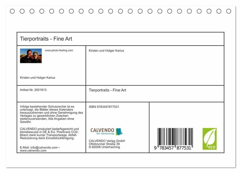 QUALITÄT - Hochwertiger Fotokalender mit 12 wunderschönen Motiven auf lichtbeständigem Bilderdruckpapier, robuste Spiralbindung.NACHHALTIG - deutliche Abfallreduzierung durch bedarfsgerechte Einzelstückfertigung, umweltfreundliches FSC-zertifiziertes Papier, Produktion in Deutschland, klimabewusste Logistik.PERFEKTES GESCHENK - Kalender für Freunde und Familie, für Kinder und Erwachsene, jung und alt, zu Weihnachten, Geburtstag oder zwischendurch.VIELFALT - Bildkalender in verschiedenen Formaten, z.B. DIN A5, DIN A4, DIN A3 sowie DIN A2. Ob Naturmotiv, Gemälde oder Fotos, ideal für ein persönliches Wohlfühlambiente.Zwölf ausgesuchte Fine Art Tierportraits in einem Kalender zusammengestellt. Fotografiert und künstlerischüberarbeitet von den Fotografen Holger und Kirsten Karius. von Autor(in): Kirsten Karius