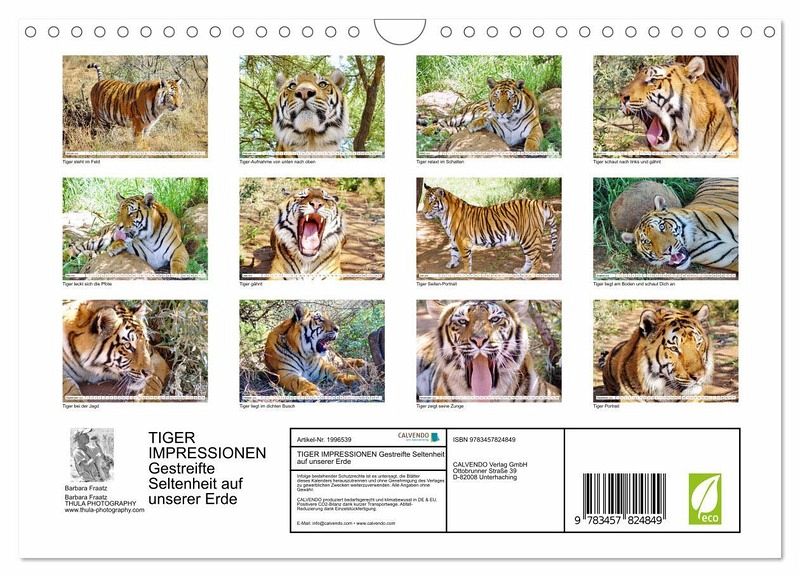 QUALITÄT - Hochwertiger Fotokalender mit 12 wunderschönen Motiven auf lichtbeständigem Bilderdruckpapier, robuste Spiralbindung mit Aufhängebügel.NACHHALTIG - deutliche Abfallreduzierung durch bedarfsgerechte Einzelstückfertigung, umweltfreundliches FSC-zertifiziertes Papier, Produktion in Deutschland, klimabewusste Logistik.PERFEKTES GESCHENK - Kalender für Freunde und Familie, für Kinder und Erwachsene, jung und alt, zu Weihnachten, Geburtstag oder zwischendurch.VIELFALT - Bildkalender in verschiedenen Formaten, z.B. DIN A5, DIN A4, DIN A3 sowie DIN A2. Ob Naturmotiv, Gemälde oder Fotos, ideal für ein persönliches Wohlfühlambiente.Die Fotografin Barbara Fraatz (www.thula-photography.com ) zeigt in diesem Fotojahreskalender ganz individuelle und fazinierende Motive von Tigern, eine gestreifte Seltenheit auf unserer Erde. von Autor(in): Thula
