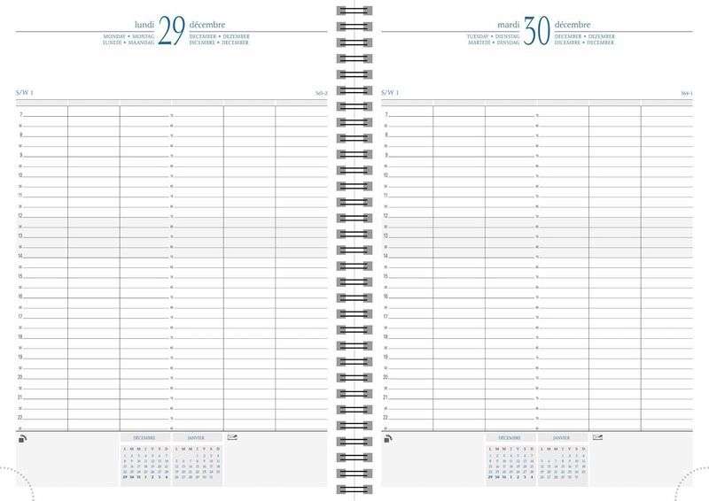 Jahreskalender, Time 29, Spiralbindung, A4, 12 Monate Der Kalender mit der Spiralbindung für eine leichte Öffnung. 1 Tag pro Seite (inkl. jeweils 1 Seite für Samstag und Sonntag). Starker Deckel mit Stoff überzogen. Weißes Papier, 2-farbiger Druck. 12 Monate: Januar bis Dezember. Von 7.00 Uhr bis 22.30 Uhr. Doppelspiralbindung. Wissenswerte Informationen. Fünfsprachige Ausgabe: Französisch, Englisch, Deutsch, Niederländisch, Italienisch. Auswechselbares Adre ssverzeichnis mit Index.