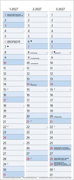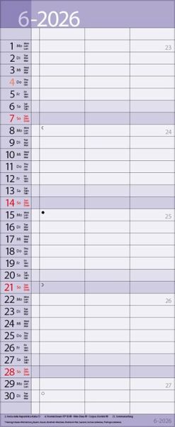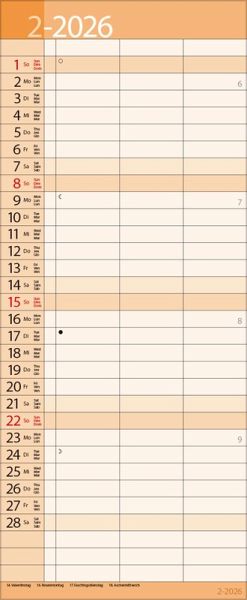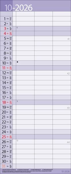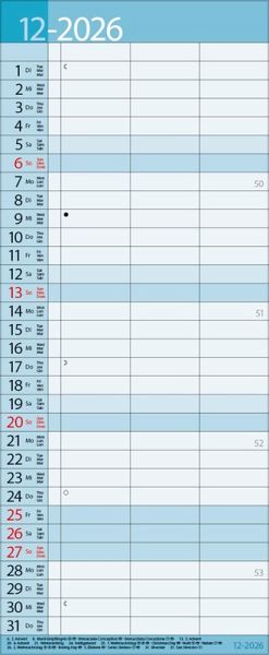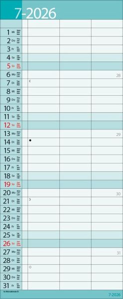 Übersichtlicher Familienplaner mit 3 großen Spalten; sehr stabile Rückwand; 19 x 46 cm Terminkalender mit viel Platz für Eintragungen, ohne störende Bilder in den Spalten leichte Beschreibbarkeit, auch mit Bunt- und Bleistiften Mehrsprachiges Kalendarium (d,e,f,i) mit regionalen Feiertagen für Deutschland, Österreich und Schweiz Farblich hervorgehobene Sonn- und Feiertage, sowie Anzeige der Zeitumstellung Gedruckt auf dickem und umweltfreundlichem FSC Papier