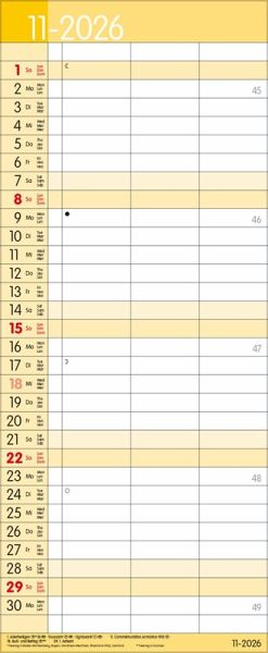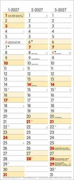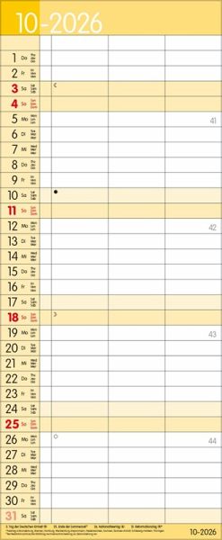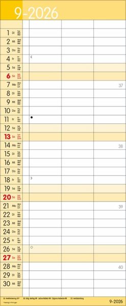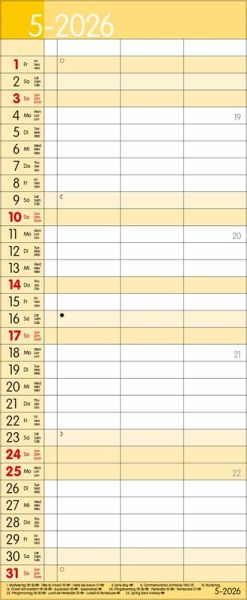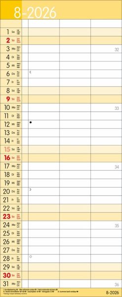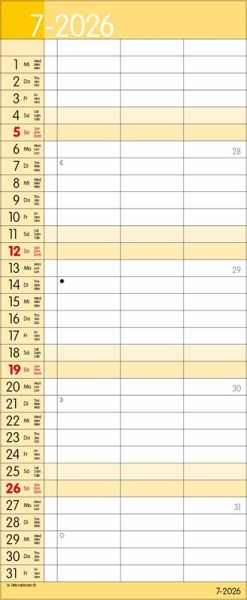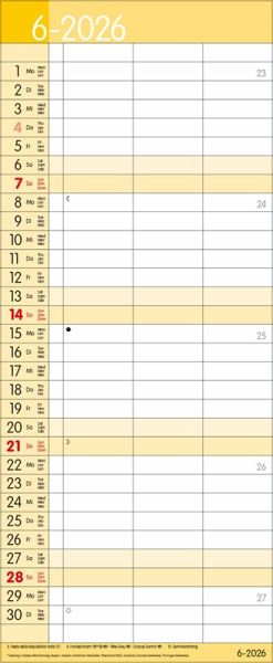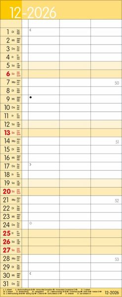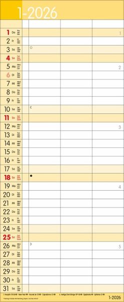 Übersichtlicher Familienplaner mit 3 großen Spalten; sehr stabile Rückwand; 19 x 46 cm Terminkalender mit viel Platz für Eintragungen, ohne störende Bilder in den Spalten leichte Beschreibbarkeit, auch mit Bunt- und Bleistiften Mehrsprachiges Kalendarium (d,e,f,i) mit regionalen Feiertagen für Deutschland, Österreich und Schweiz Farblich hervorgehobene Sonn- und Feiertage, sowie Anzeige der Zeitumstellung Gedruckt auf dickem und umweltfreundlichem FSC Papier