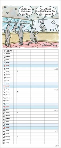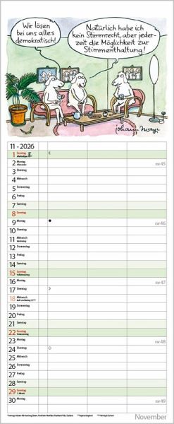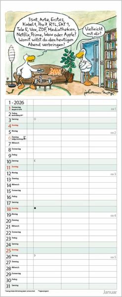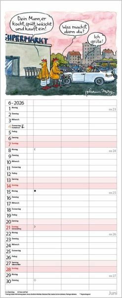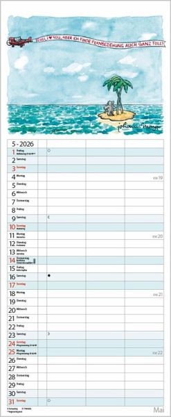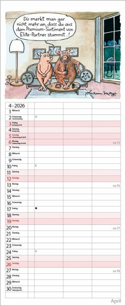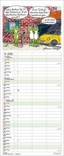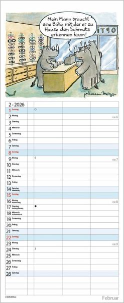 Die witzigen Paarszenen von Johann Mayr begleiten mit viel Charme durch das Jahr. Neben dem gesamten Kalenderjahr enthält der Wandplaner auch eine Vorschau bis März des Folgejahres.
