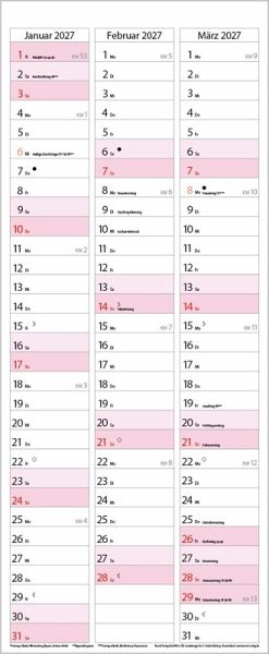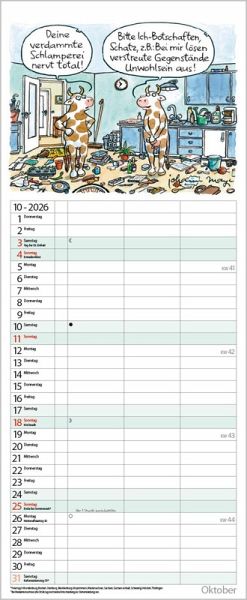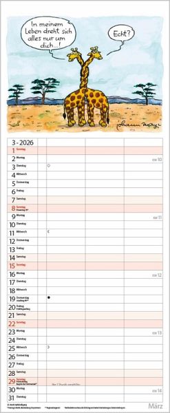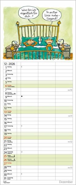 Übersichtlicher Familienplaner für bis zu 3 Personen; sehr stabile Rückwand; 19 x 46 cm Jeden Monat ein lustiger Cartoon über den Spalten. Ohne störende Bilder in den Spalten Dickes, umweltfreundliches FSC Papier; leichte Beschreibbarkeit, auch mit Bunt- und Bleistiften Deutsches Kalendarium mit regionalen Feiertagen für Deutschland, Österreich und Schweiz Farblich hervorgehobene Sonn- und Feiertage, sowie Anzeige der Zeitumstellung