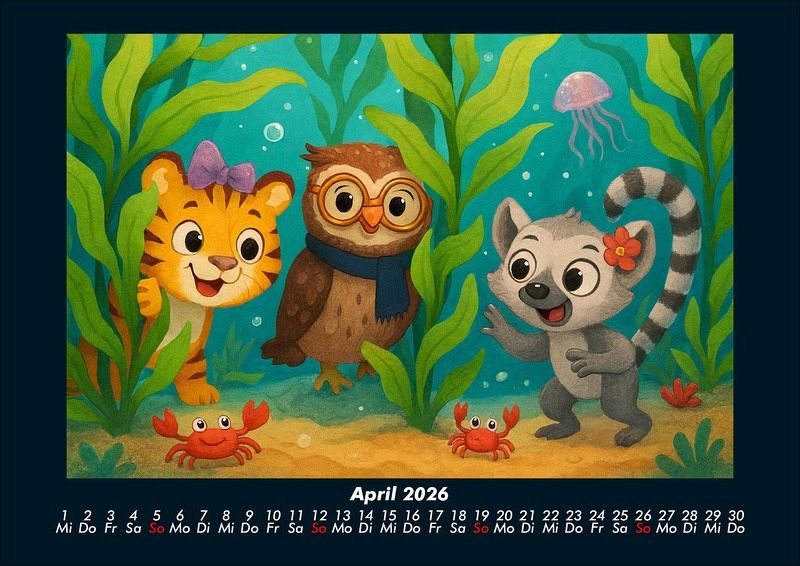 Tina, Ollie & Lulu - Unterwasserwelten 2026 Motivkalender DIN A4 Begleiten Sie Tina den Tiger, Ollie die weise Eule und Lulu den Lemur auf einer magischen Reise durch bunte Unterwasserwelten. Monat für Monat entdecken die drei Freunde neue Abenteuer: von geheimnisvollen Korallenriffen über spielerische Delfin-Begegnungen bis hin zu funkelnden Schatzhöhlen in der Tiefe. Der Kalender erzählt eine farbenfrohe Geschichte voller Fantasie, Freundschaft und Meereszauber, die Kinder und Erwachsene gleichermaßen begeistert. Ein einzigartiger Begleiter durchs Jahr für alle, die das Meer lieben. Vero-Kalender Kids zeigen liebevoll gestaltete Monatskalender mit bunten Bild-Motiven tierischer Freunde, die gemeinsam spannende Abenteuer erleben und die Welt entdecken. Ob in fernen Ländern, zwischen berühmten Sehenswürdigkeiten oder in magischen Landschaften - die fröhlichen Tiercharaktere begleiten Kinder Monat für Monat durch ein Jahr voller Fantasie, Freude und Freundschaft. Gedruckt werden die Kinder-Kalender aus dem Vero Verlag auf hochwertigem Kalenderbogen in Premium-Qualität und in verschiedenen Größen.