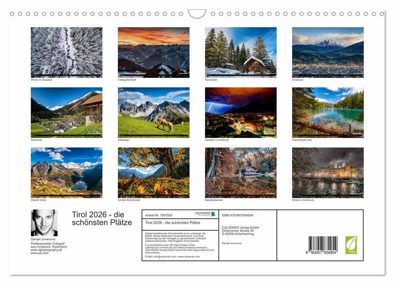 Der bekannte Innsbrucker Fotograf Danijel Jovanovic präsentiert in seinem neuen Jahreskalender schönste Motive aus dem Land Tirol. Alle Jahreszeiten zusammengefasst in einem wunderschönen Wandkalender.