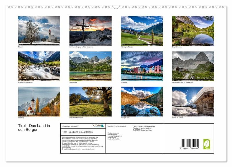 PREMIUM-LINIE - Brillanter Fotokalender mit 12 wunderschönen Motiven, Kunstdruck in Hochglanz in Museumsqualität.QUALITÄT - edle Materialien, stabile Rückwand mit 2 innovativen Einstecktaschen für eine optimale Präsentation an der Wand.NACHHALTIG - deutliche Abfallreduzierung durch bedarfsgerechte Einzelstückfertigung, umweltfreundliches FSC-zertifiziertes Papier, Produktion in Deutschland, klimabewusste Logistik.PERFEKTES GESCHENK - Kalender für Freunde und Familie, für Kinder und Erwachsene, jung und alt, zu Weihnachten, Geburtstag oder zwischendurch.Das Land Tirol von seiner schönsten Seite von Autor(in): Danijel Jovanovic