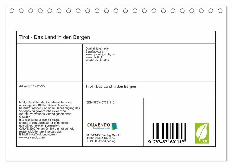QUALITÄT - Hochwertiger Fotokalender mit 12 wunderschönen Motiven auf lichtbeständigem Bilderdruckpapier, robuste Spiralbindung.NACHHALTIG - deutliche Abfallreduzierung durch bedarfsgerechte Einzelstückfertigung, umweltfreundliches FSC-zertifiziertes Papier, Produktion in Deutschland, klimabewusste Logistik.PERFEKTES GESCHENK - Kalender für Freunde und Familie, für Kinder und Erwachsene, jung und alt, zu Weihnachten, Geburtstag oder zwischendurch.VIELFALT - Bildkalender in verschiedenen Formaten, z.B. DIN A5, DIN A4, DIN A3 sowie DIN A2. Ob Naturmotiv, Gemälde oder Fotos, ideal für ein persönliches Wohlfühlambiente.Das Land Tirol von seiner schönsten Seite von Autor(in): Danijel Jovanovic