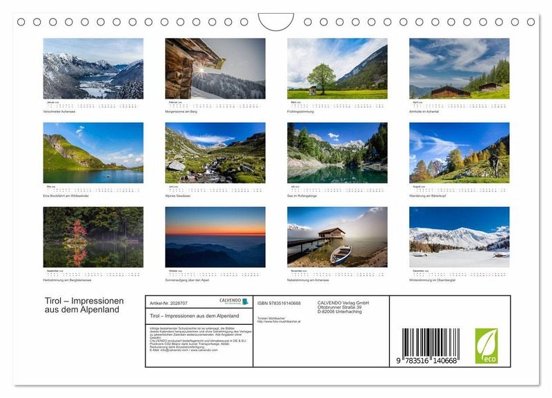 QUALITÄT - Hochwertiger Fotokalender mit 12 wunderschönen Motiven auf lichtbeständigem Bilderdruckpapier, robuste Spiralbindung mit Aufhängebügel.NACHHALTIG - deutliche Abfallreduzierung durch bedarfsgerechte Einzelstückfertigung, umweltfreundliches FSC-zertifiziertes Papier, Produktion in Deutschland, klimabewusste Logistik.PERFEKTES GESCHENK - Kalender für Freunde und Familie, für Kinder und Erwachsene, jung und alt, zu Weihnachten, Geburtstag oder zwischendurch.VIELFALT - Bildkalender in verschiedenen Formaten, z.B. DIN A5, DIN A4, DIN A3 sowie DIN A2. Ob Naturmotiv, Gemälde oder Fotos, ideal für ein persönliches Wohlfühlambiente.Impressionen aus dem Alpenland von Autor(in): Torsten Muehlbacher
