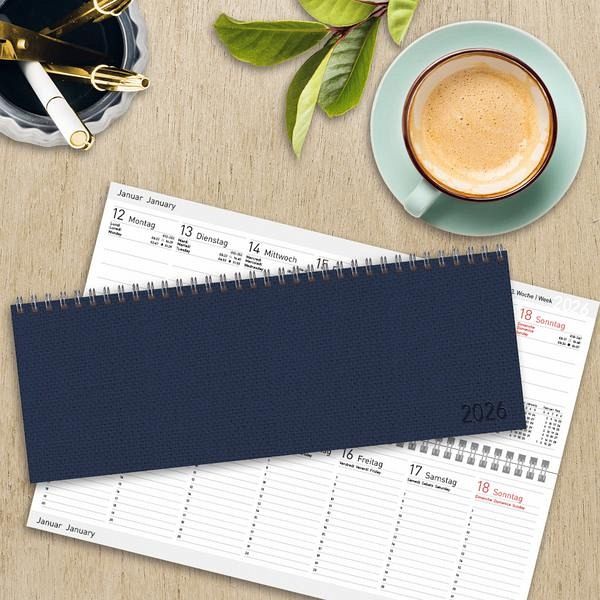 Nachhaltiger Tischquerkalender mit umweltfreundlichem Papiereinband. Hardcover dunkelblau. Spiralbindung. 128 Seiten. Pro Woche 1 Doppelseite. Kalendarium d-e-f-i.