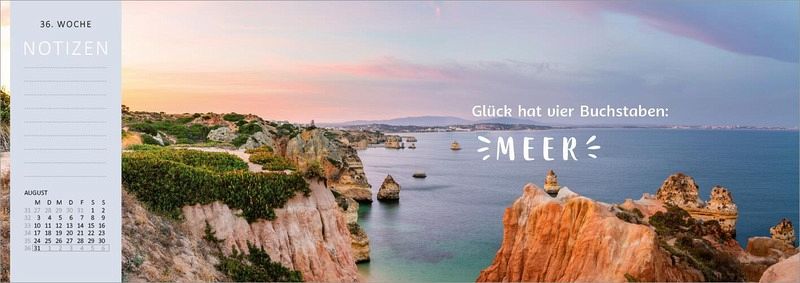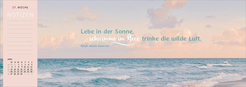 Der perfekte Wochenplaner für alle, die das Meer lieben! Mit den Zitaten und Sprüchen in diesem Kalender fühlt man fast schon die Sonne auf der Haut und hört die Wellen rauschen. Traumhafte Fotos rund um das Meer bringen jede Woche ein Stückchen Glück in den Alltag. So kann man sich jederzeit an den Strand träumen. Durch die praktische Wochenübersicht behält man Termine stets im Blick - perfekt zum Planen und Organisieren im Büro, im Homeoffice oder zu Hause. Das Wochenkalendarium gibt eine Übersicht über alle wichtigen Feier- und Gedenktage, es verfügt über eine Stundenleiste und enthält Platz für wichtige Notizen, To-do-Listen und Ideen.