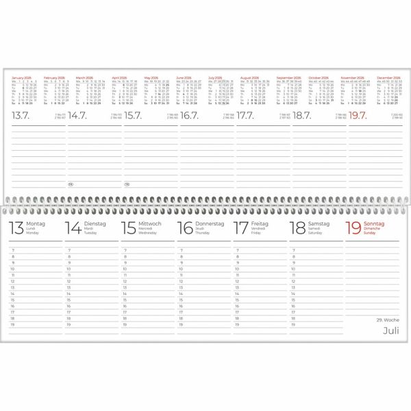 Handliches Format: 30 x 10 cm ideal für den SchreibtischÜbersichtliche Planung: 1 Woche auf 2 Seiten mit Stundenraster von 7 19 UhrStruktur & Übersicht: Tages-, Wochen- & Zinstageszähler, Zweimonatsübersicht & SteuertermineNützliche Extras: Jahresübersicht, Ferientermine & Platz für NotizenMehrsprachig: 3-sprachiges Kalendarium (DE/FR/GB) mit hervorgehobenen Sonn- & FeiertagenHochwertige Verarbeitung: Spiralbindung & stabiler Kartoneinband, FSC®-zertifiziert