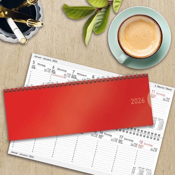 Praktischer Tischquerkalender. Cover rot. Spiralbindung. 64 Seiten. Pro Woche 1 Seite. Kalendarium d-e-f-i.