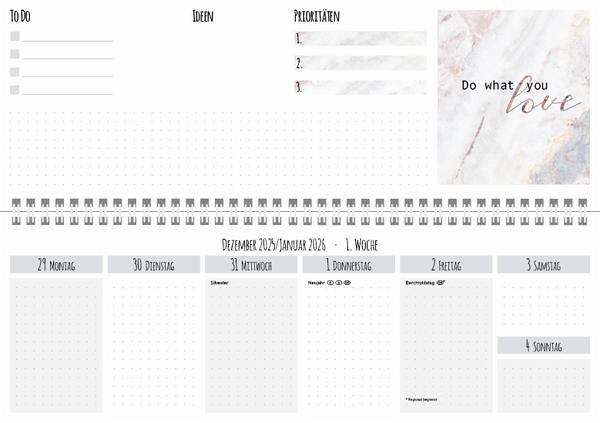 Jede Woche hält er auf 2 Seiten viel Platz für deine tägliche Terminplanung bereit: Listen für wöchentliche To-dos und Prioritäten sowie Raum für Notizen und spontane Ideen. Dabei kommt er überhaupt nicht kleinkariert daher, sondern im trendigen "dotted" Design und bietet somit individuelle Gestaltungsfreiheit bei deiner Planung. Vorschau für 2026.