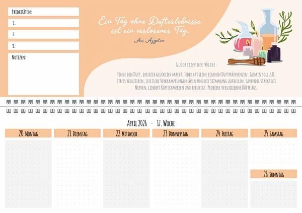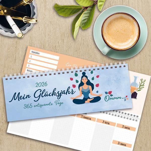 Dieser Kalender sorgt mit inspirierenden Zitaten und spannenden Anregungen dafür, dass 2026 garantiert ein glückliches und entspanntes Jahr wird. Liebevoll gestaltete Wochenseiten und viel Platz für Planung und Notizen machen den Kalender nicht nur zum praktischen Jahresbegleiter, sondern auch zum absoluten Lieblingsstück auf dem Schreibtisch. Vorschau für 2026.