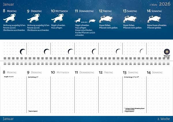 Format: 29,8 x 10,5 cm; umweltfreundliches FSC PapierJede Woche auf einer Doppelseite mit Platz für Notizen und spontane Ideen; Mit täglichen Tipps und Informationen zu den MondphasenSchulferien und Feiertage (D,A,CH) sowie Vorschau für 2027Perfektes Lay-Flat -Verhalten dank Spiralbindung