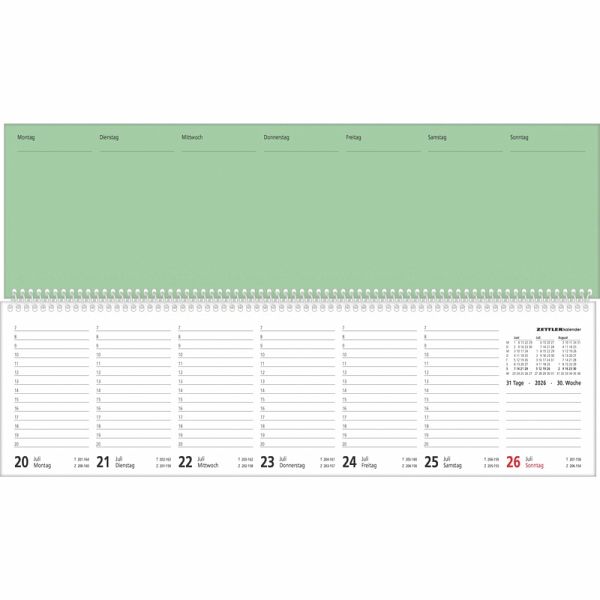 XL-Format: 36 x 11 cm großzügig und übersichtlich für alle Termine Wochenübersicht: 1 Woche auf 2 Seiten mit Stundenraster von 7 20 Uhr Besonderes Feature: Tage perforiert einzeln abtrennbar für mehr Flexibilität Praktische Extras: Dreimonatsübersicht, Tages-, Wochen- & Zinstageszähler, Steuertermine Design-Details: Abwechselnd grünes & weißes Papier für klare Orientierung Deutsches Kalendarium: Sonn- & Feiertage hervorgehoben Robust & praktisch: Spiralbindung, stabiler Kartoneinband, hergestellt in Deutschland