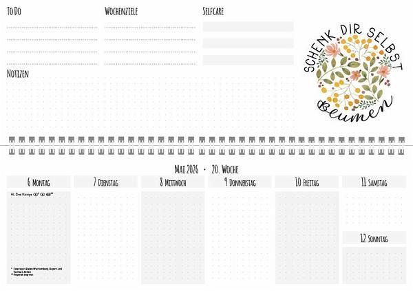 Format: 29,8 x 10,5 cm; umweltfreundliches FSC PapierJede Woche auf einer Doppelseite mit Listen für wöchentliche To-dos und Prioritäten sowie Raum für Notizen und spontane IdeenSchulferien und Feiertage (D,A,CH) sowie Vorschau für 2027Perfektes Lay-Flat -Verhalten dank Spiralbindung