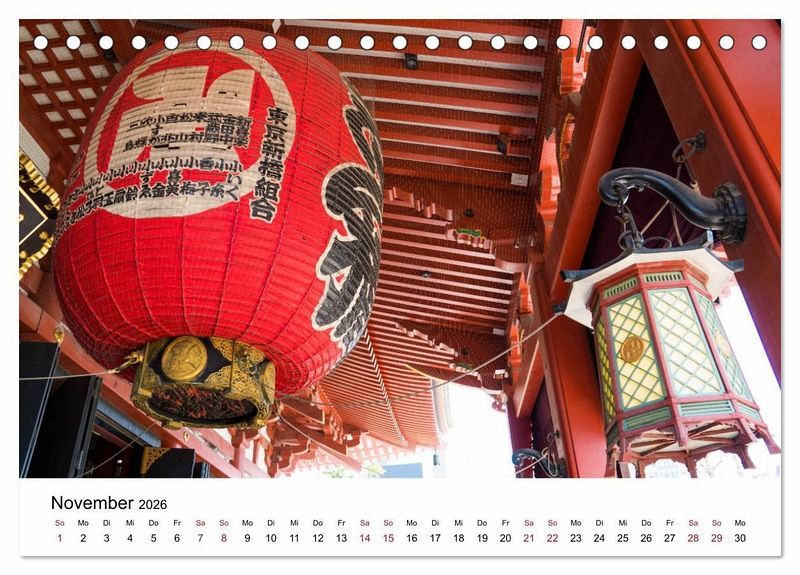 Tokio, die Hauptstadt von Japan, steht für moderne Architektur und verrückte Trends. Doch zwischen den Hochhäusern finden sich wunderschöne, historische Schreine, Tempel und Pagoden. Seit tausenden von Jahren wird hier gebetet und fanden Samurai ihre letzte Ruhestätte. Auch heute noch residiert der Japanische Kaiser in seinem Palast mitten in der Stadt. Dieser Kalender zeigt die farbenprächigen und historischen Wahrzeichen der Stadt.